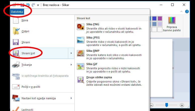 V glavnem meniju izberemo Datoteka in v podmeniju Shrani kot