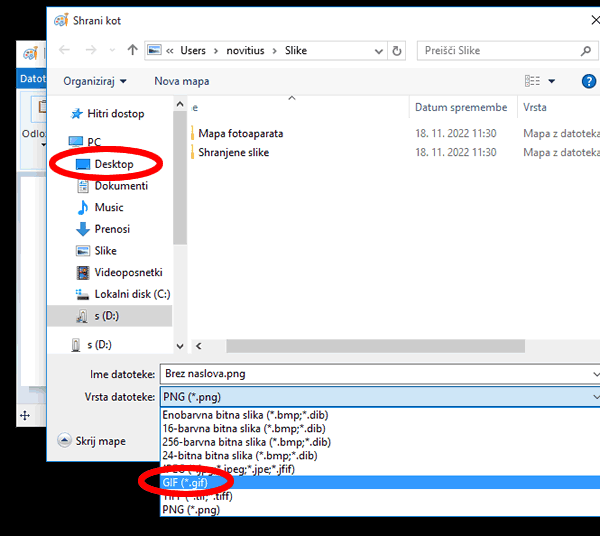 Najbolj pomembno pa je, da spremenimo vrsto datoteke. V spustnem meniju Vrsta datoteke: izberemo GIF