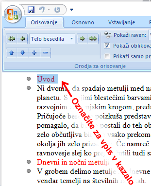 Najprej določimo vrstice z naslovi poglavij, podpoglavij,..., ki se bodo izpisala v kazalu vsebine